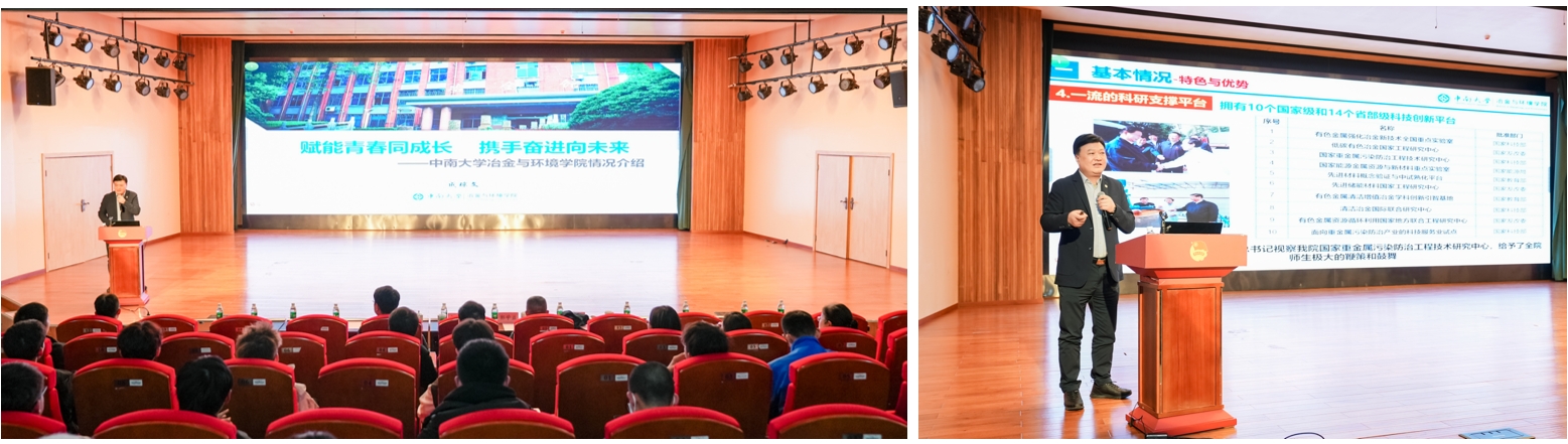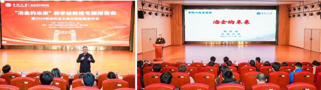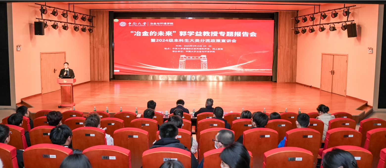 会议伊始,副校长郭学益以“冶金的未来”为题,为师生带来了一场内容丰富、见解深刻的专题报告。他从冶金的发展历程切入,结合关键金属的战略价值与资源安全保障的重要性,深刻剖析了冶金学科在国家发展中的重要地位。他强调,智能冶金是未来发展的必然方向,融合人工智能、大数据等新兴技术,推动冶金工业绿色、低碳、循环、智能、高端化发展。他鼓励同学们脚踏实地、志存高远,融入中南大学、学习冶金专业、实现人生理想。