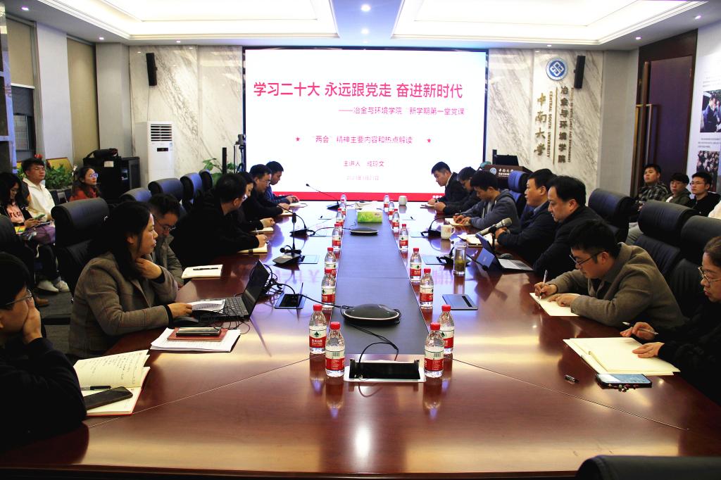 3月23日下午,学院党委书记成琼文在新校区金贵楼208会议室为学院师生党员代表讲授新学期第一堂党课。学院党委副书记张凯、副院长陈爱良及各党支部书记,综合教工党支部、环境所研究生第一党支部、碱法所研究生党支部、冶化所研究生党支部党员代表及全体辅导员参加。