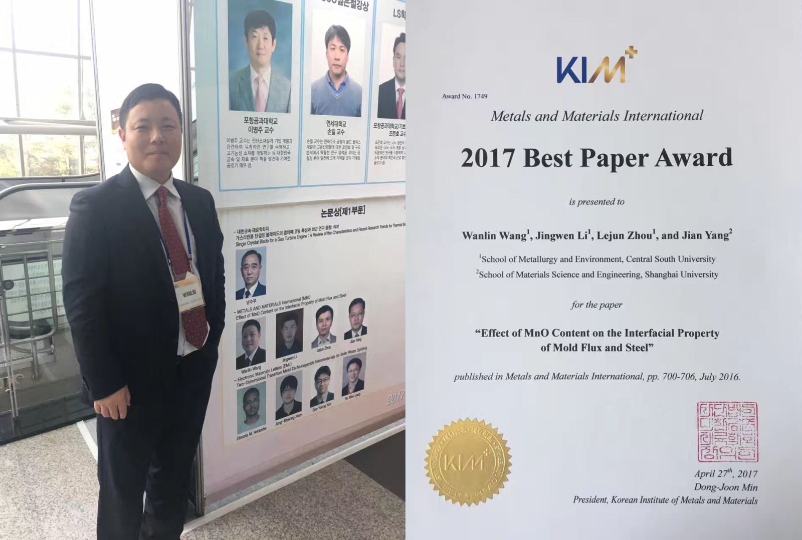 王万林教授团队(第一作者及通讯作者,中南大学)和时任宝钢股份研究院首席研究员杨健合作的题为“Effect of MnO Content on the Interfacial Property of Mold Flux and Steel”(Met. Mater. Int., Vol.22, No.4, (2016), pp. 700)的论文获得了该学会的“2017年最佳论文奖”;这也是韩国金属材料学会首次将最佳论文奖颁给外国学者。