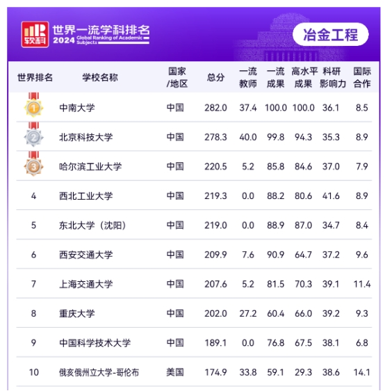 2024软科世界一流学科排名发布,中南大学冶金工程学科再次登顶